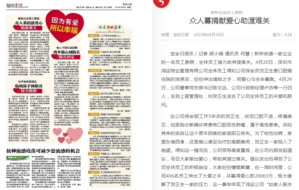 鴻運(yùn)物業(yè)愛(ài)心捐助,獲寶安日?qǐng)?bào)報(bào)道。報(bào)道內(nèi)容如下: