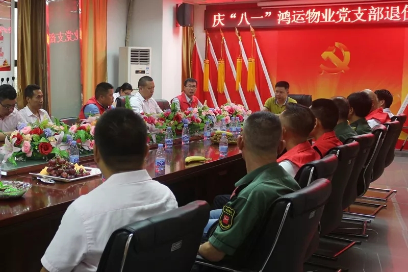 ?????? 8月1日下午,鴻運(yùn)物業(yè)黨支部退伍軍人座談會(huì)在總部召開,公司總經(jīng)理陳總、董事兼黨支部書記陳董、常務(wù)副總經(jīng)理麥總攜全體黨員參加了此次座談會(huì),彰顯公司高層和黨支部對(duì)建軍節(jié)的重視,對(duì)軍人的敬重,對(duì)退伍軍人的關(guān)愛。