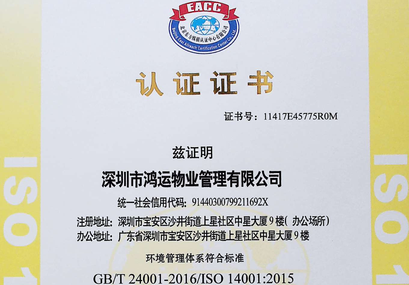 ISO14001認(rèn)證證書
