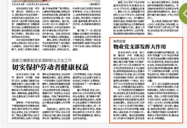6月11日,寶安日報以“新橋街道物業(yè)黨支部發(fā)揮大作用”為題,對我司黨支部工作進行報道。以下為報道全文: (寶安日報數(shù)字版·新聞展示↑↑) (寶安日報紙質版·新聞展示 ↑↑) 鴻運物業(yè)黨支部將再接再厲,充分發(fā)揮黨支部的帶頭作用和黨員的模范作用,將黨建融入物業(yè)管理工作中,助力社區(qū)建設,助力基層治理,助力社會安定!