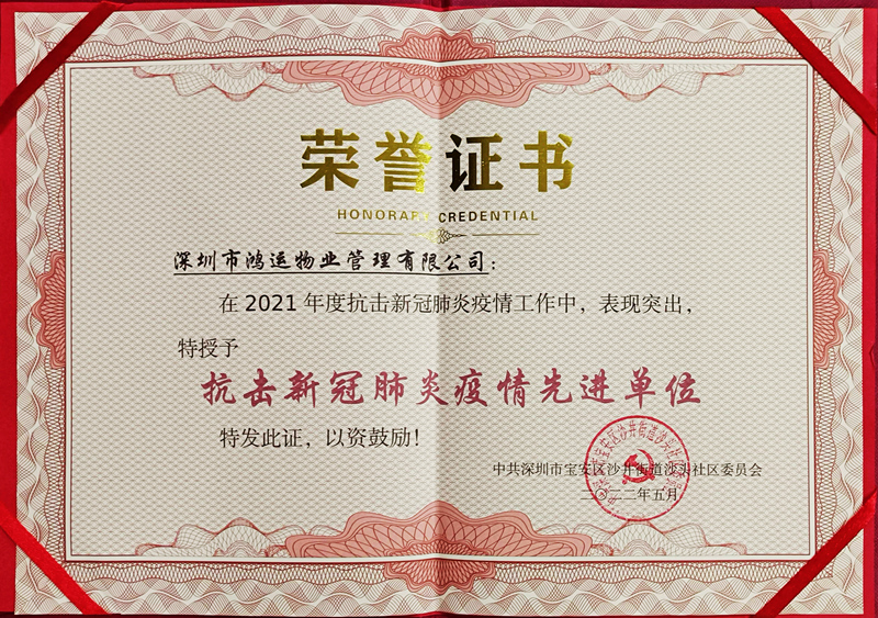? ? ? ?5月18日,鴻運物業(yè)再次榮獲深圳市寶安區(qū)沙井街道沙頭社區(qū)授予的“抗擊新冠肺炎疫情先進單位”的稱號。這是鴻運物業(yè)連續(xù)第二年獲得該稱號,在此感謝沙頭社區(qū)委員會對我們防疫工作的肯定,鴻運物業(yè)將繼續(xù)嚴格踐行上級下達的防疫政策,把相關措施做實做細,將疫情防控網織得更密更牢,當好社區(qū)的“守護者”。